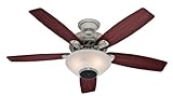 The Hunter Fan Fan 21629 is a Concert Breeze Fan Ceiling Fan with the Remote for Separate Light and Audio Functions. Three Speed Pull Chain for Fan in the Brushed Nickel motor finish. Introducing Hunter’s new Concert Breeze with Soundolier Wireless Audio Technology – the first and only fan-sound system combination that blends the cool comfort of moving air with the rich beauty of audio. Because a ceiling fan is typically centered overhead in the room, it’s also the premium location for a speaker – literally showering sound down to everyone in the room. The Concert Breeze utilizes a proprietary 2.4GHz wireless system that’s easily adapted to your television, stereo or any other audio source. Using four distinct stereo signal channels, this system virtually eliminates any wireless interference and transmits up to 300 feet away, with no extra wires to run. Available exclusively from Hunter, the new Concert Breeze is the perfect accompaniment to any room. This Ceiling Fan is from the Concert Breeze Collection and is UL Indoor rated. The Concert Breeze Fan Includes 3″ (3/4″ Interior Diameter) Pole.The Hunter 21629 Concert Breeze Ceiling Fan with Sound System is the only fan on the market that combines the cool comfort of freshly fanned air with clear, high-definition audio. Showcased in a handsome Brushed Nickel design, this unique cooling and entertainment system includes four distinctive stereo channels and is compatible with most audio sources.